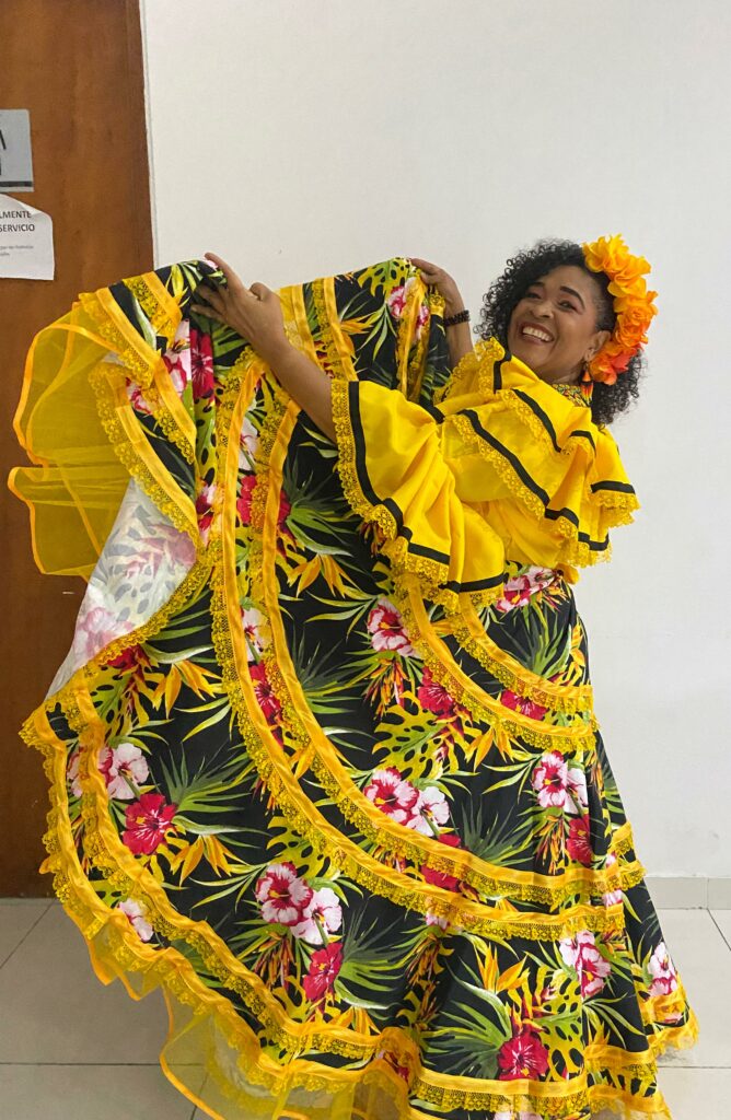 Ma grand-mère a été pêcheuse pendant longtemps, et la famille de ma mère était et est encore composée de poissonnières et de pêcheurs. Et on me dit que mon grand-père aimait beaucoup danser le bullerengue. J’ai appris en écoutant, j’ai aussi appris par hasard, parce qu’un jour ils avaient besoin d’une personne pour faire les chœurs pour une chanteuse du Pacifique, et ils m’ont cherchée parce que je venais de María la Baja. Alors, la surprise était que je ne connaissais pas le folklore, mais là j’ai commencé à travailler avec une personne qui était du folklore et qui avait beaucoup à voir avec le folklore, et c’était Tomás Terán, le fils d’une grande chanteuse. Eh bien, je dis toujours qu’avec lui, j’ai appris. Il me dit que non, parce que j’ai ça dans le sang. Il dit « ça, tu l’as dans la peau, dans le sang, tu l’as en toi. Ce qui se passe, c’est que tu ne t’en es jamais rendu compte et que tu n’as jamais exploré cette partie ». Alors, maintenant que je l’explore, j’ai l’impression d’aimer et de vivre pour la tradition, et que chaque fibre, chaque poil, chaque cheveu, chaque ongle, tout fait partie de la tradition.