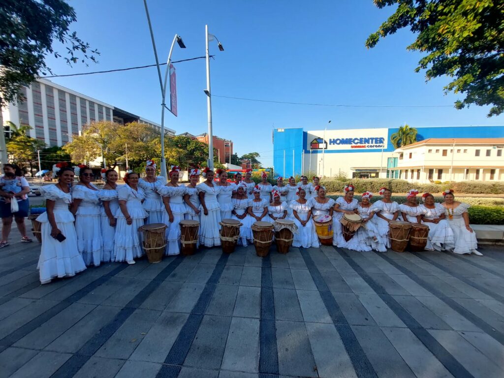J’ai un groupe de dames et de personnes âgées. Et aussi de jeunes ; des dames qui n’avaient jamais eu de contact direct avec la tradition. J’ai eu l’idée de créer un groupe et de commencer à les aider à en savoir un peu plus sur la tradition des Caraïbes colombiennes. Non seulement pourqu’ils connaissent la musique ancestrale, mais qu’ils aient aussi un endroit pour faire de la musique et occuper un peu plus leur temps libre en faisant de la musique. Et qu’aussi elles se sentent utiles à leur tour. Parce que sur la côte, comme partout ailleurs, les dames d’un certain âge se consacrent simplement à élever leurs petits-enfants. Dans notre Caraïbe, c’est comme ça. Alors, en arrivant à Barranquilla, je me suis rendu compte que ce sont des dames qui peuvent encore vivre, profiter, faire des choses par elles-mêmes et qu’on peut les prendre en compte. Et si elles ont voulu le faire quand elles étaient jeunes, elles n’en ont pas eu l’occasion.